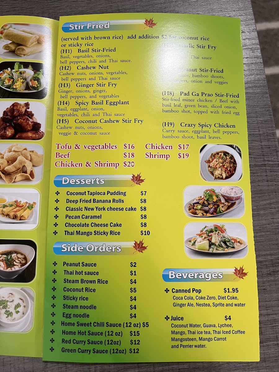 “ This restaurant offers delicious food, with large portions, at an amazing value. I'll be honest, I didn't expect to love the food as much as I did. The sauce in the curry was so rich and flavorful, the meat and vegetables were cooked perfectly, and the sticky rice was a great match. If you're craving Thai food, I highly recommend giving this place a try. I will say, however, the restaurant could use a few upgrades in decor, and serving water in beer glasses was an odd choice. ”